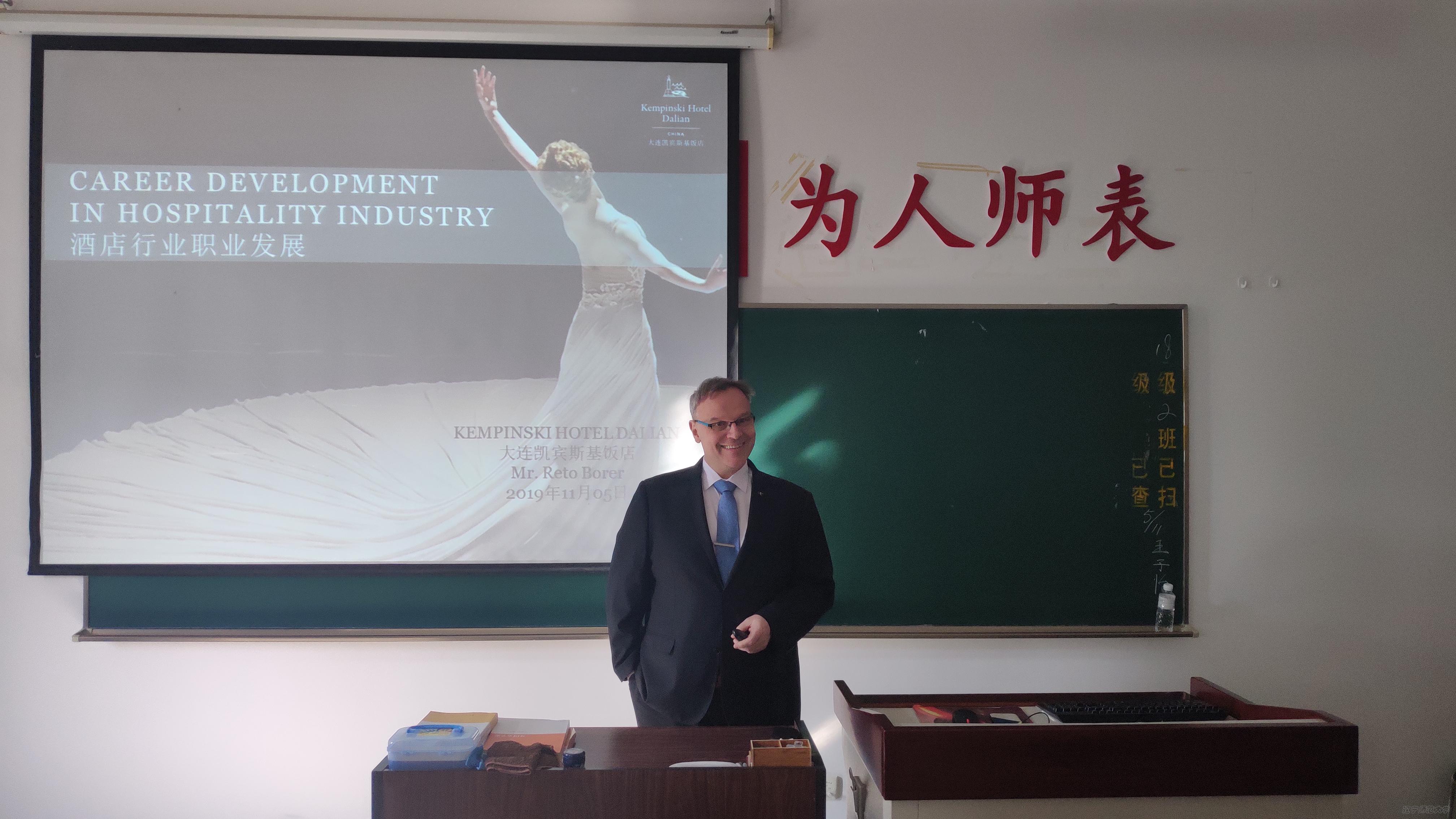 2019年11月5日早上10时,辽宁师范大学历史文化旅游学院于西山湖校区三教B203教室举办“五星级酒店宾客满意度及忠诚度”主题讲座,本次讲座有幸邀请到大连凯宾斯基酒店总经理博雷尔先生及人事经理韩雪女士为学院学子进行讲授,学院副院长武传表、酒店管理专业老师丛述出席本次会议,旅游专业研究生,2017级酒店管理专业,2019级旅游管理专业、酒店管理专业本科生到场学习。