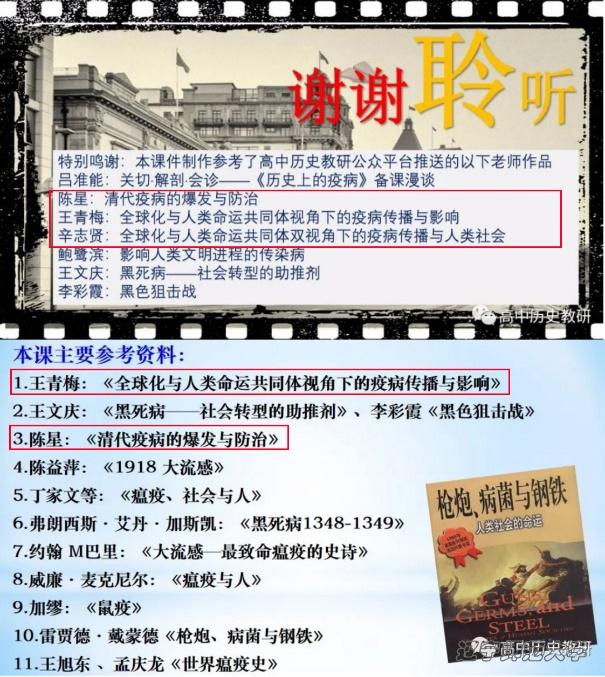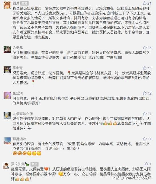 高中历史新教材《中外历史纲要》于2019年秋季开始使用,相关资料和教学设计资料不足。针对这一情况,在关娴娴、杨晓军两位教师的悉心指导下,学院教育硕士研究生积极发挥集体智慧,为《中外历史纲要》(上、下)共计60课时的教学内容制作了全套精美的教学设计课件。目前发表在高中历史教研平台上共计31个。这些作品弥补了高中历史教师备课资源短缺的现状,也收到了来自各界的认可,为我校赢得了广泛美誉。今年2月,面对新冠肺炎疫情的蔓延态势,学院研究生结合专业优势,在“高中历史教研”平台发表了以“医疗与公共卫生”为主题的教学课件,对历史上疫病流行的时空特点、疫病对人类社会的影响、疫病的防治措施、抗击疫病的经验教训等做了系统的介绍,普及了疫情的相关知识,为“战疫”贡献着自己的专业力量。这些教学作品与当前疫情防控紧密结合,又突出立德树人的教学理念,被高中历史教研平台设为“独家精品”,受到了专业教师的一致好评,许多一线教师纷纷转引。